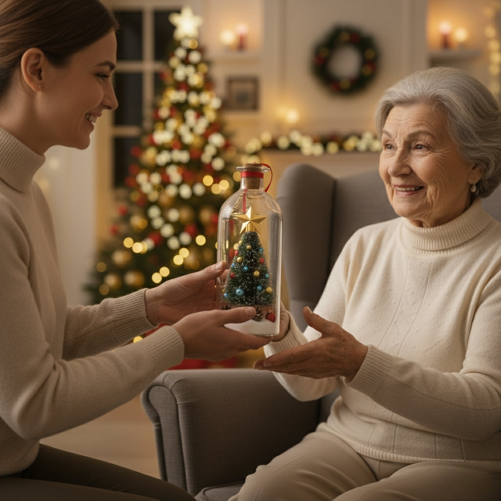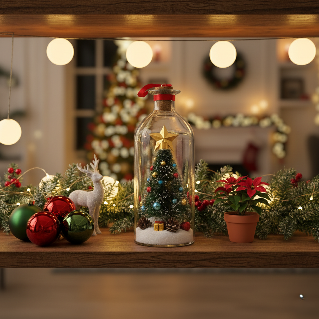 This isn't just a Christmas ornament. It's a time capsule in a bottle—a miniature Christmas tree nestled inside hand-blown glass, topped with a golden star and wrapped with a velvet ribbon.
